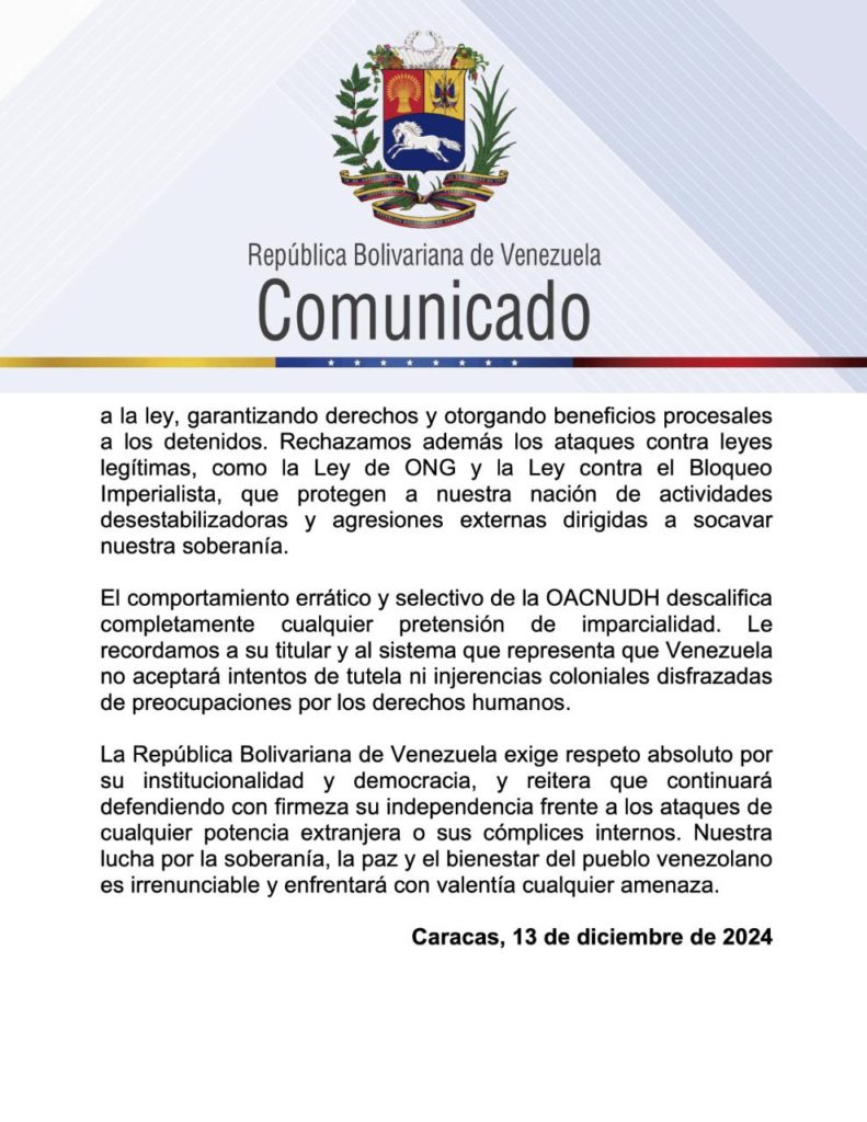 Acusan a la Oacnudh de servir a “sectores que promueven el caos, la desestabilización y la intervención extranjera, ignorando deliberadamente las acciones violentas financiadas desde el exterior”.También califican el pronunciamiento como lejano a la “imparcialidad”, así como “errático” y “selectivo”. “Le recordamos a su titular y al sistema que representa que Venezuela no aceptará intentos de tutela ni injerencias coloniales disfrazadas de preocupaciones por los derechos humanos”, agrega el escrito