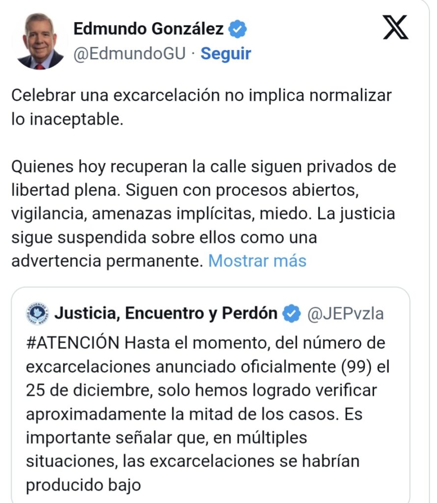 El dirigente opositor Edmundo González Urrutia se pronunció este viernes sobre las excarcelaciones de 99 personas detenidas tras las elecciones presidenciales de 2024 en Venezuela, y aseguró que celebrar estas liberaciones “no implica normalizar lo inaceptable”.