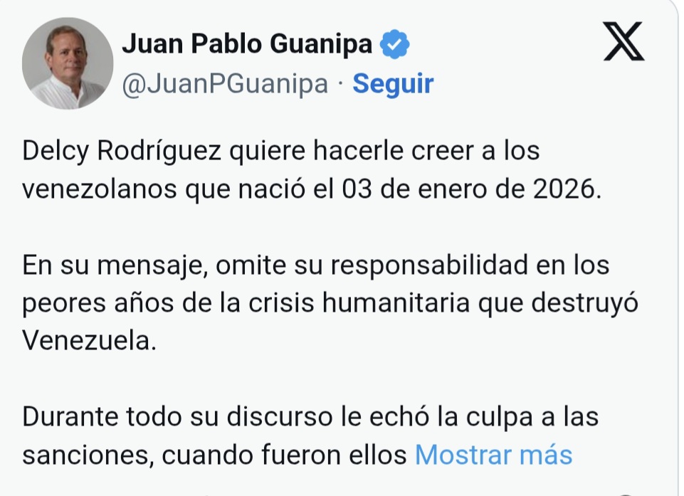 “Delcy Rodríguez quiere hacerle creer a los venezolanos que nació el 03 de enero de 2026 (…) En su mensaje, omite su responsabilidad en los peores años de la crisis humanitaria que destruyó Venezuela”, acotó el dirigente nacional de Primero Justicia (PJ) en su cuenta de X.