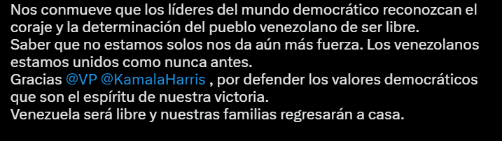 «Saber que no estamos solos nos da aún más fuerza. Los venezolanos estamos unidos como nunca antes. Gracias, Kamala Harris, por defender los valores democráticos, que son el espíritu de nuestra victoria. Venezuela será libre. Nuestras familias volverán a casa», expresaron.