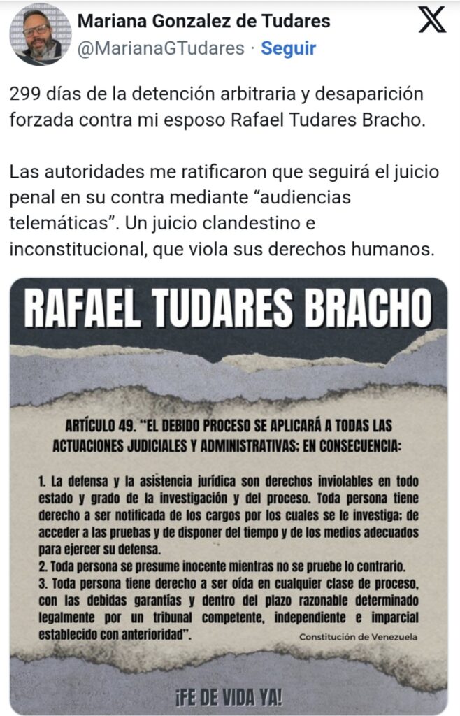 En su mensaje, recordó el artículo 49 de la Constitución venezolana, que establece la obligación del Estado de garantizar la defensa, la presunción de inocencia y el acceso a un juicio ante un tribunal independiente e imparcial, dentro de un plazo razonable.