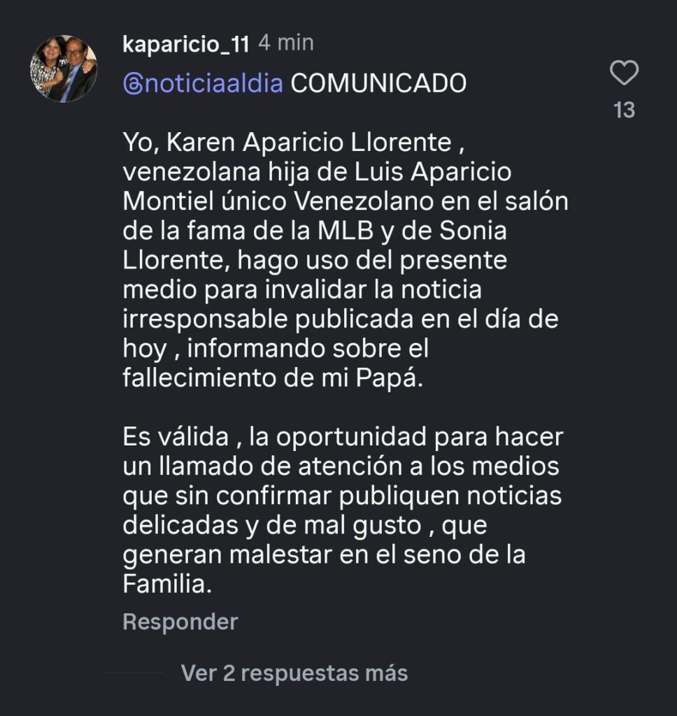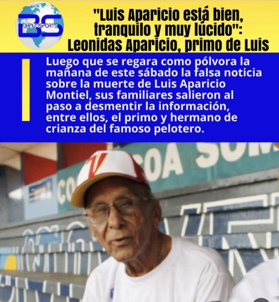 “Desde el @premioluisaparicio desmentimos las falsas noticias sobre el estado de salud de nuestro Luis Aparicio, quien se encuentra en su residencia de Barquisimeto junto con su esposa, familiares y personal médico que siempre está atento a sus cuidados diarios.@nelsonaparicio11 @kaparicio_11 y el mismo @mp8sports, presidente del @premioluisaparicio, pueden dar fe de su buen estado de salud y hacen un llamado a la comunidad, especialmente a los medios de comunicación, de no hacerse eco de informaciones que no sean confirmadas por su entorno familiar.