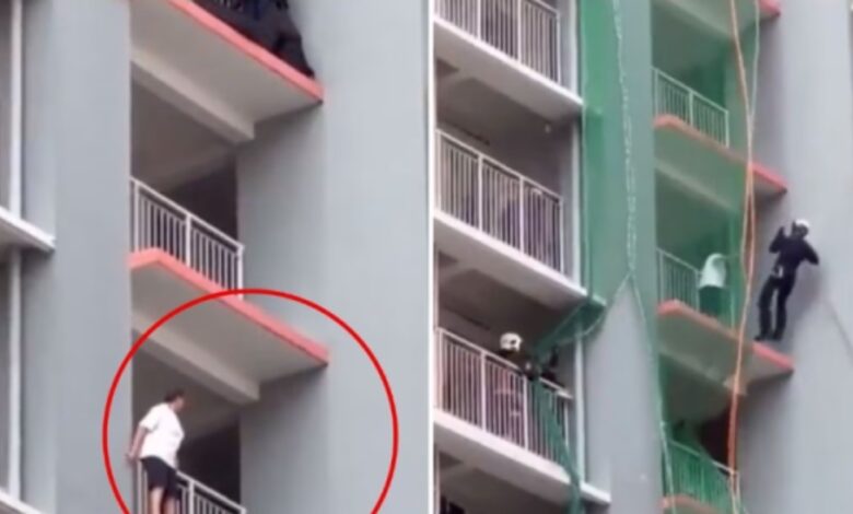 El video muestra como la mujer amenaza con lanzarse del balcón, de hecho está por delante de las barandas, lo que facilita poder cumplir su objetivo. Sin embargo, también se ve a los rescatistas no solo en el piso desde el que se quiere lanzar la mujer, sino en otros pisos de arriba y abajo.