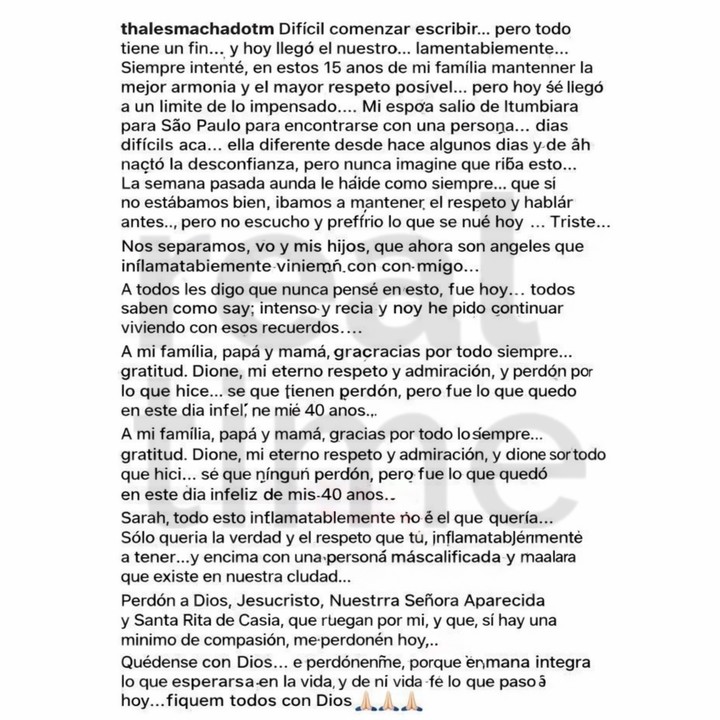 Acto seguido, habría explicado la situación de su matrimonio: «Mi esposa salió de Itumbiara hacia Sao Paulo para encontrarse con una persona… fueron días difíciles aquí. Ella estuvo distinta desde hace algunos días y de ahí nació la desconfianza, pero nunca imaginé que esto llegaría a este punto. (…) Nos separamos: yo y mis hijos, que ahora son ángeles que, inevitablemente, vienen conmigo».