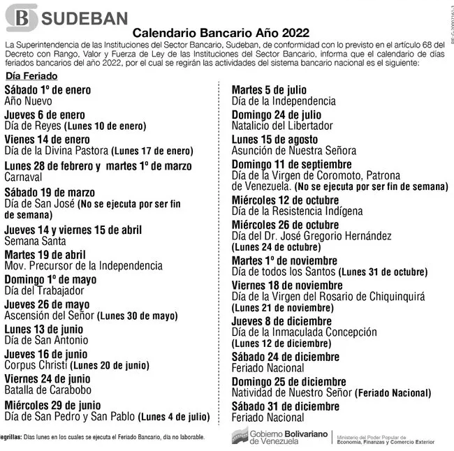 Sudeban publicó en diciembre el calendario bancario para este 2022. En tal sentido, al igual que en años previos, este miércoles la banca y otros sectores no estarán activos, puesto que hay una fiesta nacional.