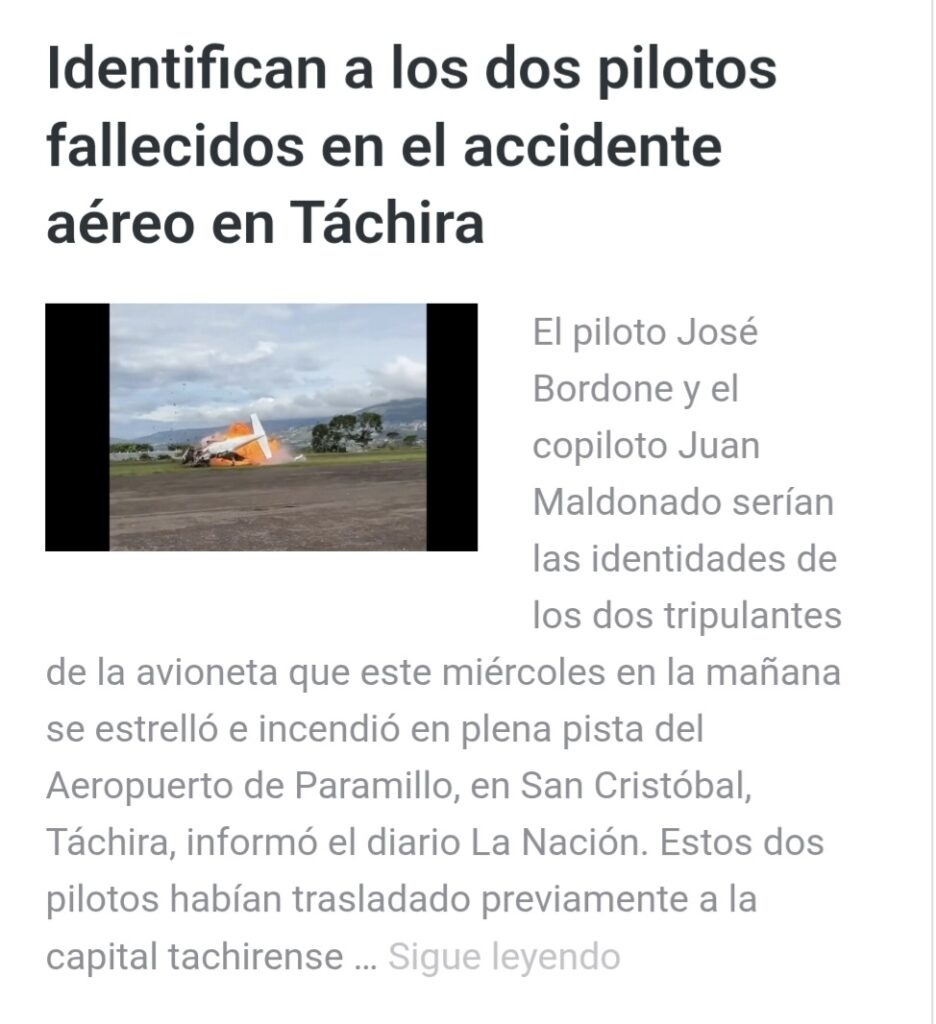 Lamentablemente en el mismo resultaron fallecidos los dos (02) tripulantes a bordo», destacó la institución.Las víctimas eran el piloto José Bordone y el copiloto Juan Maldonado, según se desprende de medios de comunicación tachirenses.