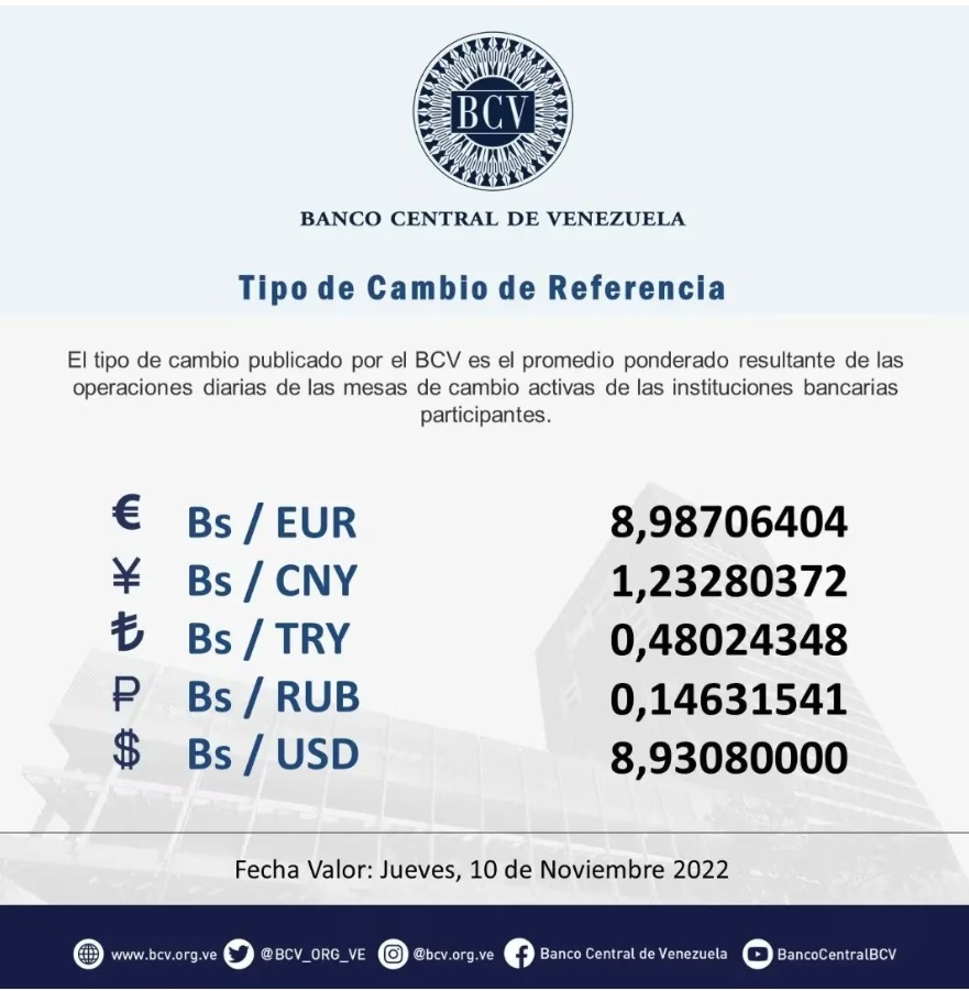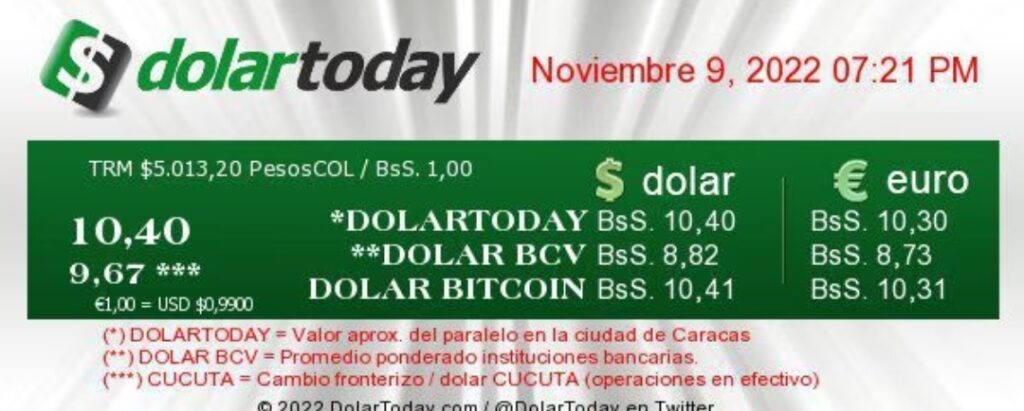 El DolarToday presentó el precio del dólar en Venezuela a Bs. 10,40 para este jueves 10 de noviembre de 2022, según el último reporte de su plataforma. En tanto, la plataforma Monitor Dólar dispuso un promedio de Bs. 10,39 por dólar. La cotización es superior a la tasa oficial determinada por el Banco Central de Venezuela (BCV).