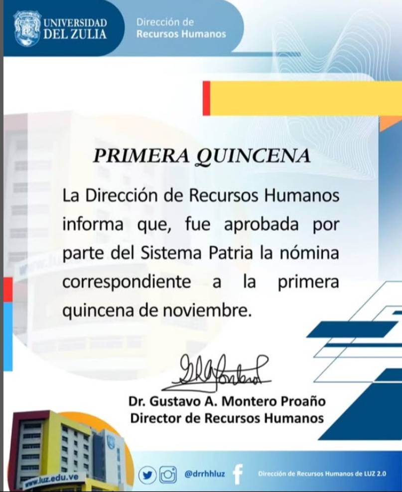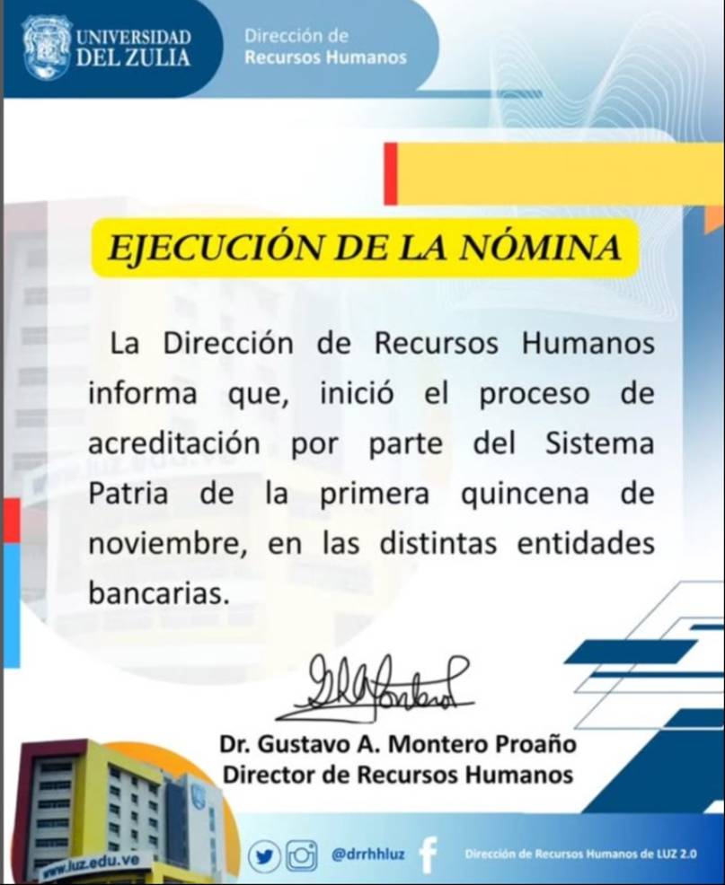 A través de un comunicado difundido en redes sociales, la dirección de Recursos Humanos de la Universidad del Zulia informó sobre el pago de la primera quincena de noviembre.