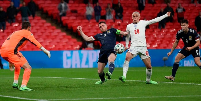 Inglaterra, consciente de su supuesta superioridad, salió con ganas, con el pecho por delante. Escocia, ingenua, sin darse cuenta que no estaban tan por detrás. Casi les cuesta el partido. Un córner puesto por Mason Mount lo remató solo John Stones, en posición inmejorable, pero al larguero.