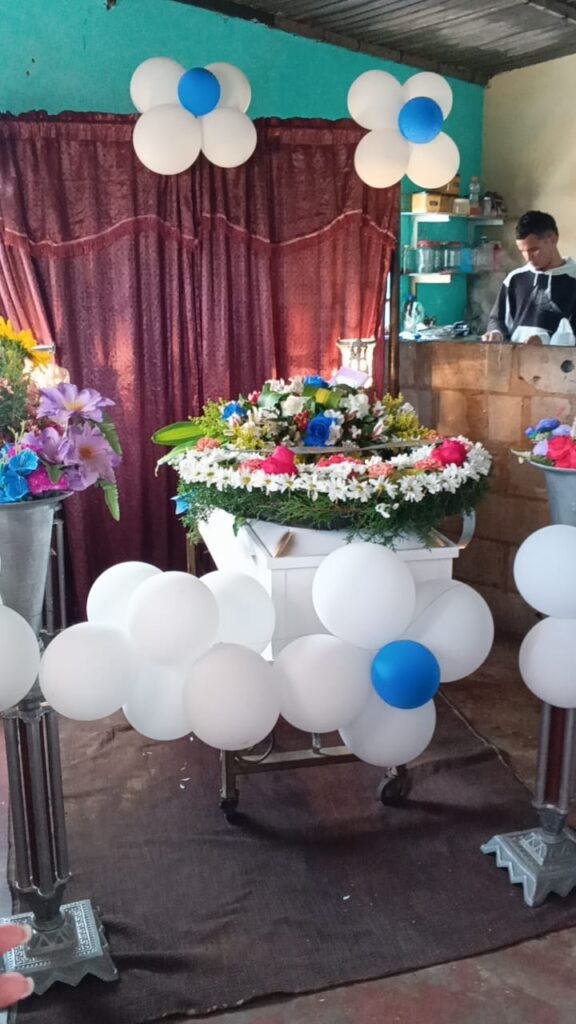 En un pequeño ataúd blanco con globos y flores colocadas en la sala de su humilde hogar, el niño Juan Carlos Mencía, de 9 años, recibió el último adiós de sus familiares y amigos después de perder la vida tras ingerir alimentos presuntamente intoxicados en un comedor comunitario, ubicado en el barrio Suramérica de San Francisco.