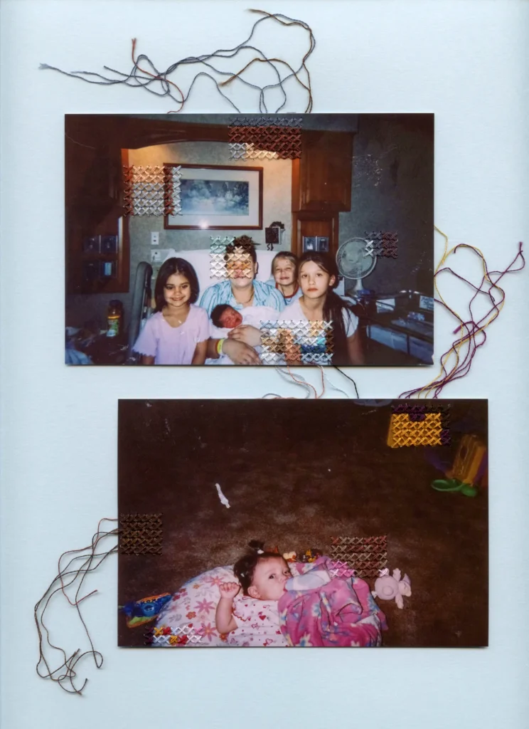 Foto superior: La madre de Mayliaia la sostiene en el hospital con sus tres hermanas mayores. Foto inferior: Maylia como un bebé. Crédito:Collage de Han Cao para ProPublica. Imágenes de la fuente: Cortesía de Mariah Zimmer.