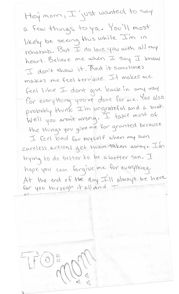 Jack le escribió a su madre una nota antes de ir a rehabilitación. Crédito:Cortesía de Carrie Harrison