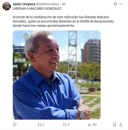 A través de su cuenta en X, Oropeza confirmó la excarcelación con un breve mensaje: «LIBERAN A MACARIO GONZÁLEZ. Al borde de la medianoche de este miércoles fue liberado Macario González, quien se encontraba detenido en el SEBIN de Barquisimeto desde hace tres meses aproximadamente».