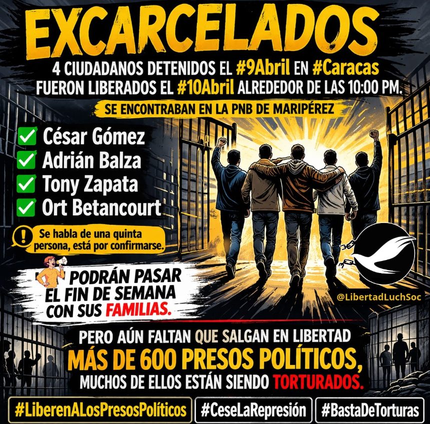 Himiob indicó que Foro Penal confirmó al menos otras tres liberaciones el viernes de personas detenidas durante las mismas protestas en Caracas, quienes también deberán presentarse ante tribunales el lunes para verificar si se les impone alguna medida.