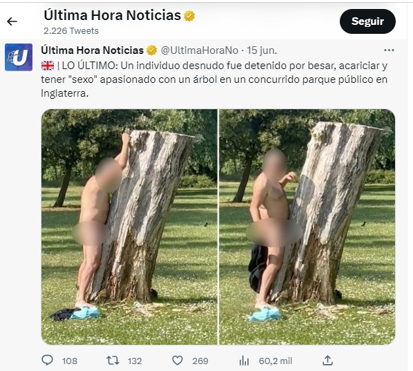 El hecho ocurrió específicamente en un concurrido parque público en Inglaterra, el hombre habría tenido sexo con un tronco que al parecer estaba seco.