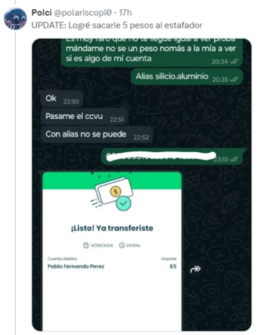 Después, ‘Pol’ le solicitó que él le envíe por lo menos un peso para corroborar si era solo su cuenta la que funcionaba mal. “Logré sacarle 5 pesos al estafador”, concluyó el chico a través de un hilo que compartió en la red social, haciendo referencia a que finalmente el estafador no pudo robarle plata. El posteo recibió más de 17 mil likes y cientos de comentarios.