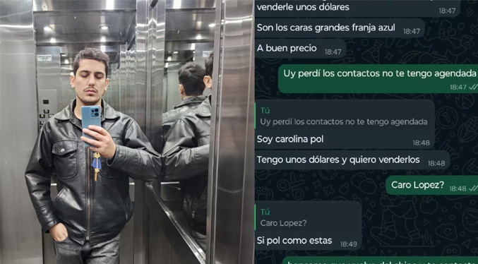 En las capturas de pantalla de la conversación que publicó el twittero, se puede ver que en primer lugar le llegó un mensaje desde un número al cual no tenía agendado, que le preguntaba si conocía a alguna persona de confianza para venderle dólares. Inmediatamente él le respondió que no sabía quién era porque no tenía el nombre en sus contactos.