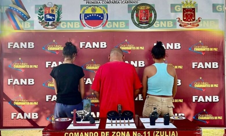 Un hombre y dos mujeres, a quienes se les atribuyen los delitos de extorsión y cobro de vacunas a productores agropecuarios en el municipio Santa Rita del estado Zulia, fueron detenidos durante este fin de semana por efectivos militares adscritos al comando de zona Nro. 11 de la Guardia Nacional Bolivariana.