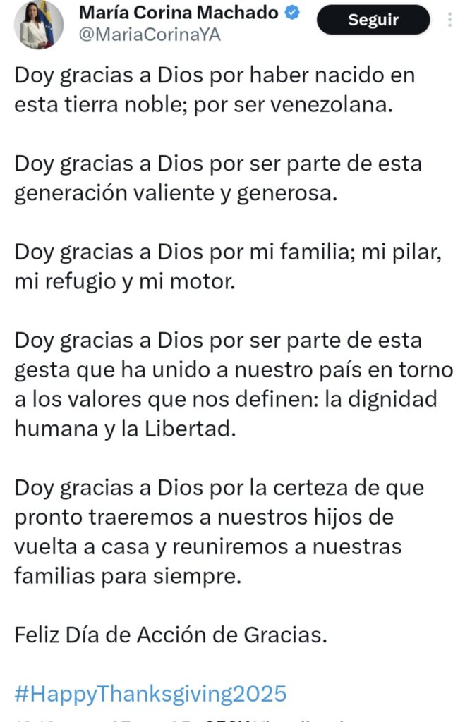María Corina Machado, premio Nobel de la Paz, envió este jueves 27 de noviembre su mensaje del Día de Acción de Gracias y aseguró: “Pronto reuniremos a nuestras familias para siempre”.