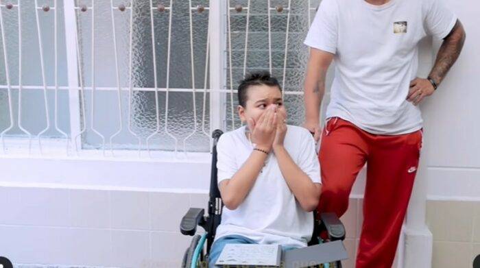 El joven no estaba enterado de la sorpresa, por lo que no pudo evitar las lágrimas cuando el cantante le hizo entrega de los papeles de la residencia.