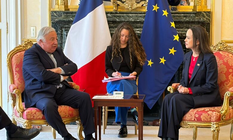 María Corina Machado abordó la transición en Venezuela con el presidente del Senado de Francia