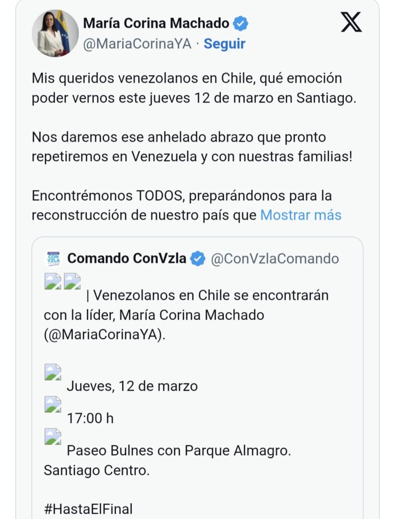 A través de sus redes sociales, Machado expresó su entusiasmo por reunirse con la diáspora venezolana en el país austral. “Mis queridos venezolanos en Chile, qué emoción poder vernos en Santiago.