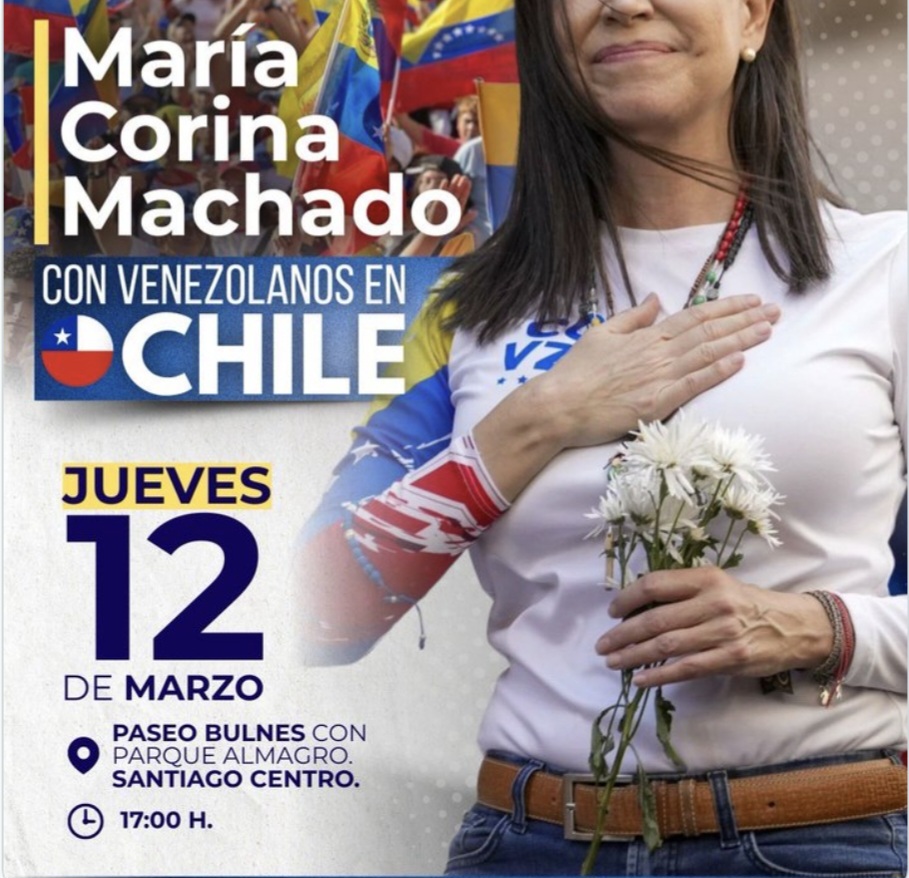 La dirigente opositora venezolana María Corina Machado sostendrá un encuentro con la comunidad venezolana residente en Santiago de Chile el próximo jueves 12 de marzo a las 17:00 horas, en el sector de Paseo Bulnes con Parque Almagro, en pleno centro de la capital chilena.