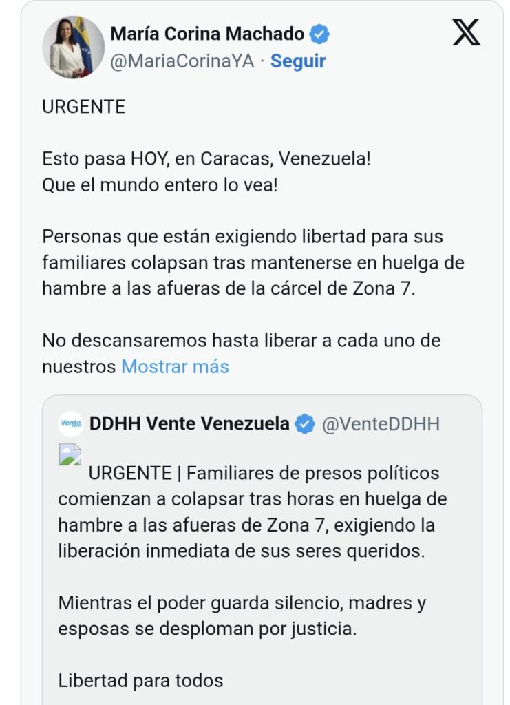 MCM denuncia deterioro de familiares en huelga de hambre frente a Zona 7Machado difundió mensajes en su cuenta en X, donde compartió imágenes y reportes de personas que se desploman y padecen debilidad extrema.