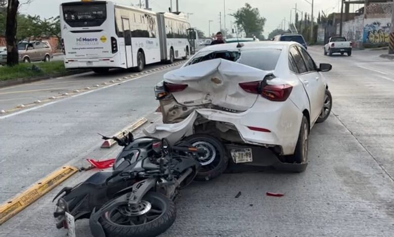 El suceso se reportó en horas de la tarde de este domingo. El conductor de la motocicleta, un ciudadano aún sin identificar, impactó la parte posterior del automóvil con tal fuerza que su cuerpo terminó sobre el techo del carro.