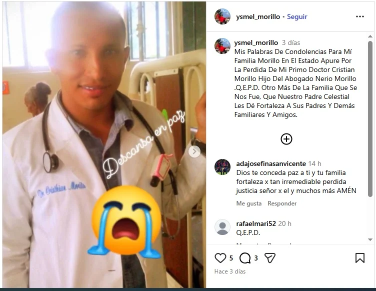 El médico y expreso político Cristian Morillo falleció la noche del lunes 30 de marzo en el estado Apure, tras un severo deterioro de su salud que, según denuncias, estuvo relacionado con las condiciones de su privación de libertad.