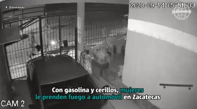 Cámaras de seguridad captaron el momento en el que dos mujeres, con gasolina y un cerillo, incendiaron un automóvil que se encontraba estacionado en la cochera de un domicilio en la ciudad de Zacatecas.