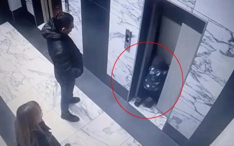 Un vídeo grabado desde un bloque de pisos en Voronezh, Rusia , muestra al niño pequeño apoyando su peso en la puerta del ascensor, que de alguna manera cedió.
