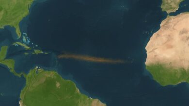 La gran mancha marrón que aparece en imágenes satelitales del Atlántico tropical y traza una banda entre la costa occidental…