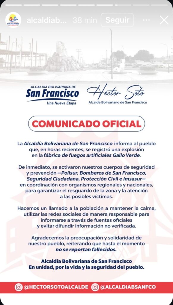 En un comunicado oficial, la Alcaldía de San Francisco se pronunció sobre la explosión registrada la mañana de este jueves en el almacén de la empresa Comercial Gallo Verde, dedicada a la fabricación y venta de fuegos pirotécnicos en la zona industrial del municipio sureño.