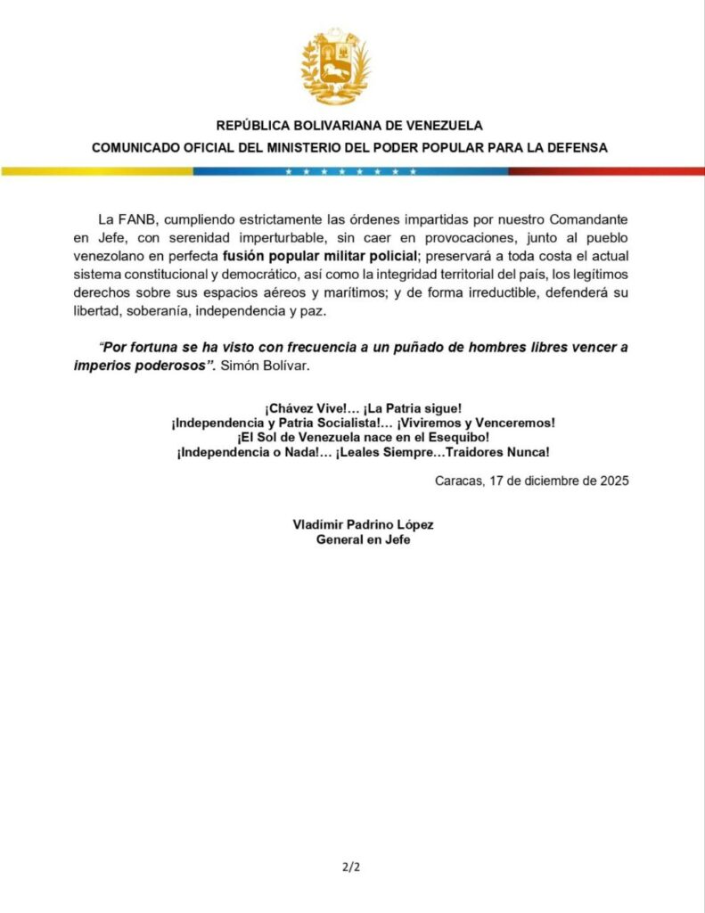 El ministro de Defensa, Vladimir Padrino López, calificó como “temerarias” las recientes amenazas del presidente de Estados Unidos, Donald Trump, contra Venezuela.