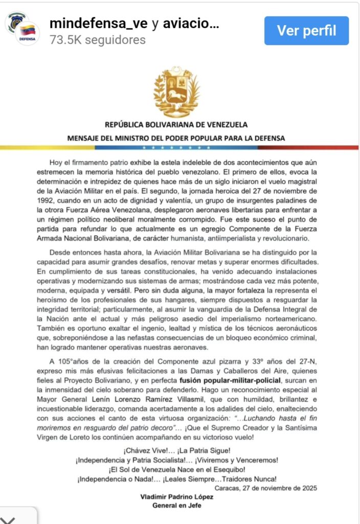Este jueves, el ministro de Defensa, Vladimir Padrino López, elogió la «determinación e intrepidez» de la Aviación Militar Venezolana en el marco del «¡Día de Rebelión Antiimperialista!», que se conmemora este 27 de noviembre.