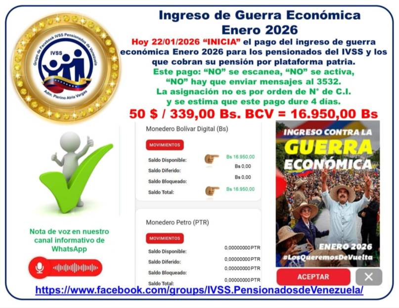 MONTO: Bs. 16.950Este 22 de enero, también se está cancelando la pensión IVSS por un monto de Bs 130.