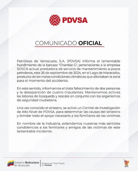 Luego de la trágica muerte de cuatro tripulantes, así como el rescate de 20 personas y la desaparición de dos ellos, la empresa Petróleos de Venezuela (PDVSA), emitió un comunicado oficial.En el informe lamentaron el hundimiento de la barcaza Chantise G, perteneciente a la empresa Sosca, actual prestadora de servicios de mantenimiento a pozos petroleros, hecho ocurrido este jueves 26 de septiembre, en el Lago de Maracaibo, a la altura de tía Juana.