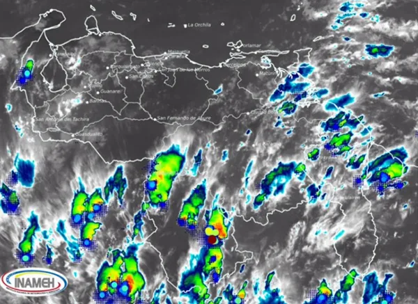 En horas de la tarde, sobre Venezuela prevalece nubosidad parcial y zonas poco nubladas; sin embargo, se observan mantos nubosos generando precipitaciones de intensidad variable al sur de nuestra Guayana Esequiba.