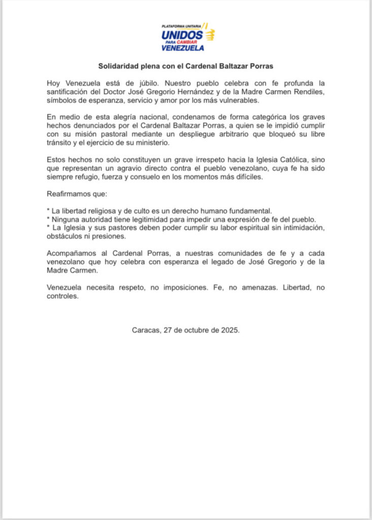 La Plataforma Unitaria Democrática (PUD), expresó este lunes su “enérgica condena” ante el impedimento que sufrió el cardenal Baltazar Porras para trasladarse al pueblo de Isnotú, en el estado Trujillo, donde planeaba cumplir actividades pastorales vinculadas al legado del beato José Gregorio Hernández, recientemente canonizado como el primer santo venezolano.