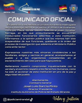 El Instituto Autónomo de Policía del estado Miranda (PoliMiranda) anunció la suspensión de varios funcionarios implicados en la muerte de Yonaiker Sárraga, un joven fallecido el pasado domingo en el sector El Piñal II de Guarenas, estado Miranda.