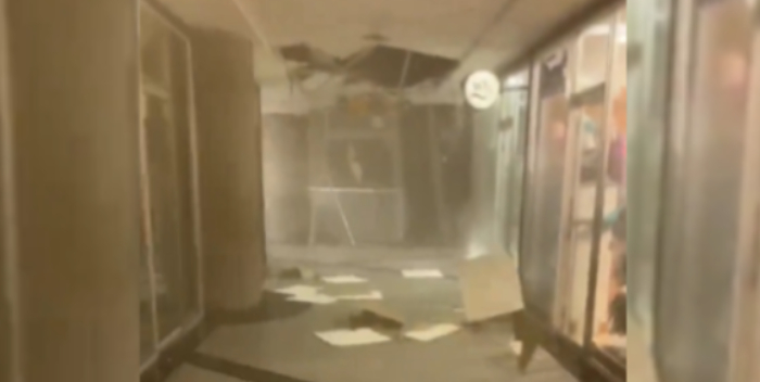 A través de videos compartidos en redes sociales, se puede apreciar como en uno de los pisos la brisa impactaba sobre una de las tiendas y a los pocos segundos, se desplomó una parte del techo raso del pasillo.