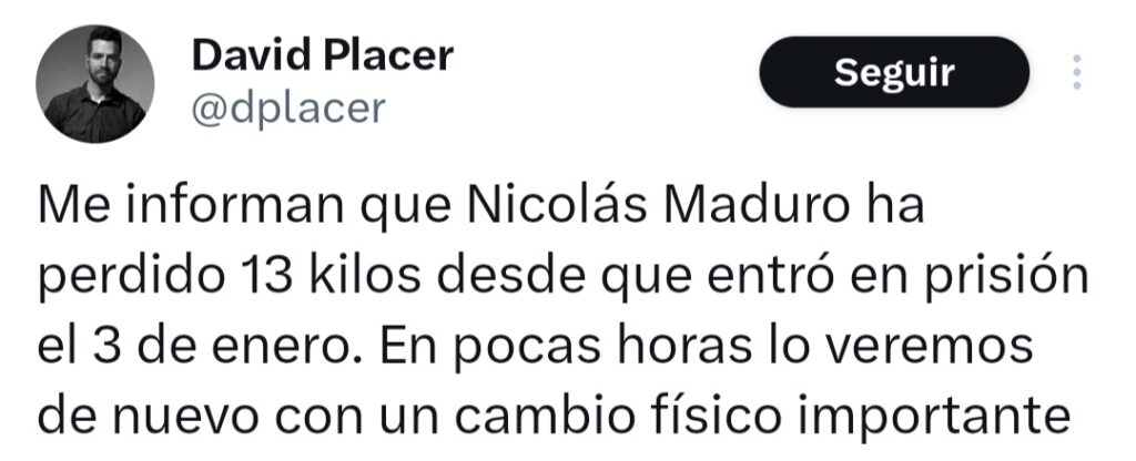 Placer adelantó además que en las próximas horas se podrá observar nuevamente a Maduro en público, lo que permitiría confirmar visualmente los cambios físicos reportados tras casi tres meses bajo custodia.