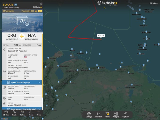Un presunto dron estadounidense MQ‑4C Triton, identificado como un P‑8A Poseidon, habría sobrevolado la Región de Información de Vuelo (FIR, en inglés) Maiquetía en la madrugada de este martes 27 de enero.