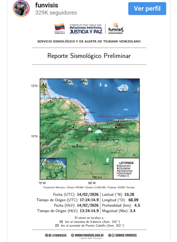 Los habitantes sintieron a las 13:24:14 (hora local) de este sábado 14 de febrero un sismo de magnitud de 3,4 en Valencia, estado Carabobo, según informó la Fundación Venezolana de Investigaciones Sismológicas (Funvisis).De acuerdo a la publicación en sus redes sociales, el epicentro del movimiento telúrico fue a 15 km al noroeste de Valencia y 23 km al suroeste de Puerto Cabello, con una profundidad de 4,5 km.
