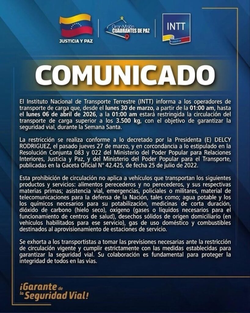 El Instituto Nacional de Transporte Terrestre (INTT) informó que, desde este lunes 30 de marzo, a partir de la 1.00 de la madrugada, y el lunes 6 de abril, a la misma hora, estará restringida la circulación del transporte de carga con un peso superior a los 3.500 kilogramos.