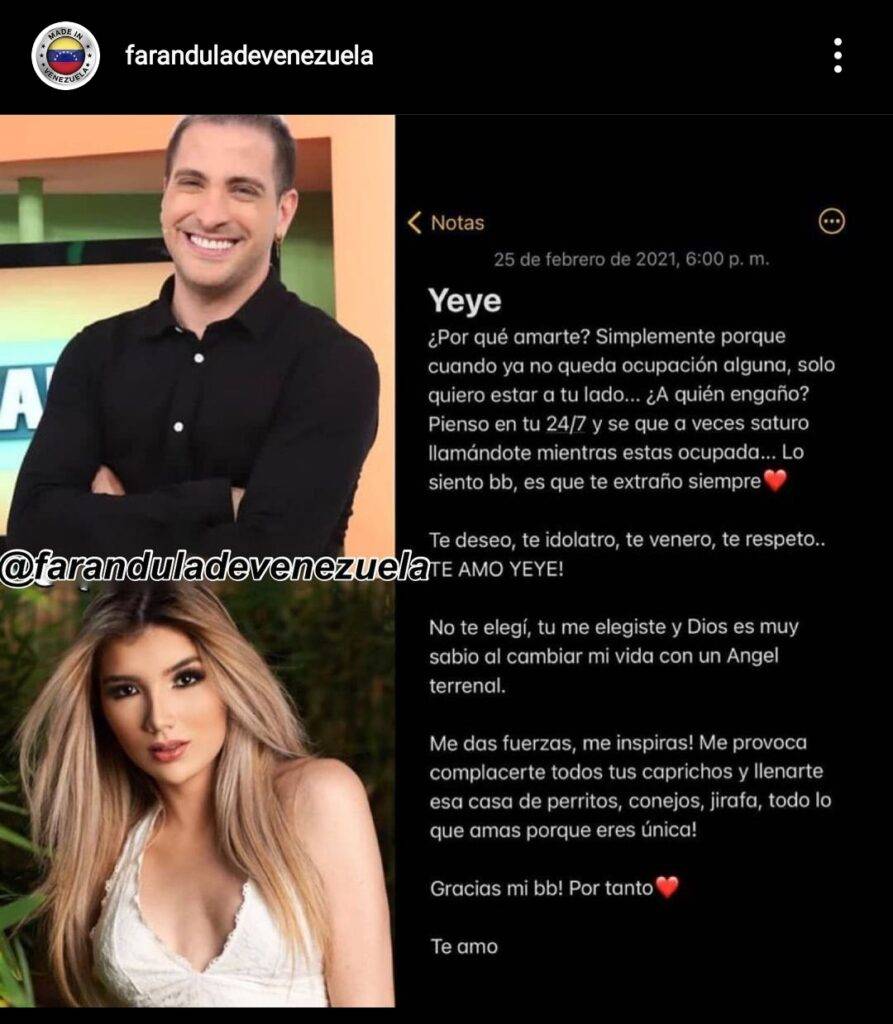 Específicamente, la carta data del 23 de febrero y, en el texto, el venezolano se deshizo en amor, dulzura y halagos para su compañera sentimental. La modelo confesó que ella no tenía la más mínima idea de la existencia del escrito y que revisando entre las cosas de la computadora de Dave, la encontró.