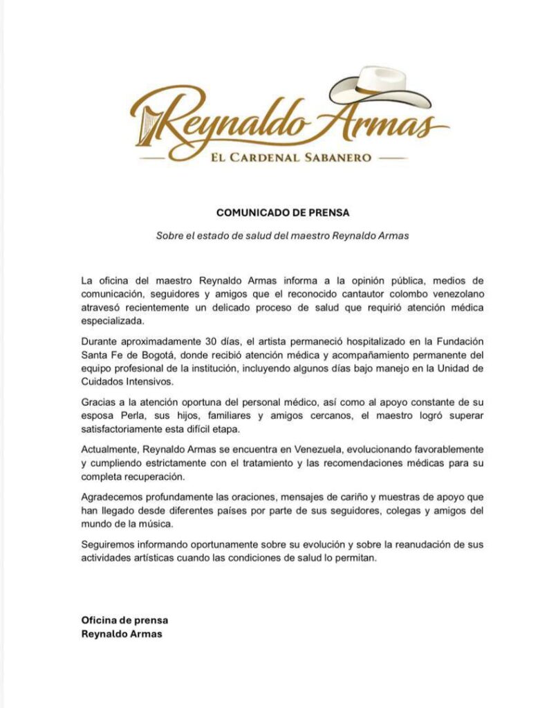 Asimismo, en días anteriores, el interpreté declaró a través de un video en sus redes sociales los pormenores de su evolución. «Me encuentro en la habitación 1107 de la Fundación Santa Fe. Hoy cumplo exactamente 30 días tras una complicación, pero gracias a Dios todo ha salido bien», comentó con agradecimiento. En su mensaje, admitió que el proceso no fue sencillo: «Han sido días largos, peligrosos y bastante fuertes; no ha sido nada fácil», confesó.Los problemas de salud del cantautor se hicieron públicos en diciembre de 2025, cuando un intenso dolor de columna le impidió terminar un concierto en el estado Apure. Aquel incidente, que le causó una baja de tensión en pleno escenario, derivó en una cirugía lumbar que su hijo, Reymar Armas, calificó como un éxito total. Para un artista con cinco décadas de trayectoria ininterrumpida, esta pausa forzada ha representado un tiempo de descanso necesario.