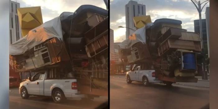 Lo que llama la atención de inmediato es la enorme cantidad de objetos y el volumen de carga que lleva consigo la camioneta. Cajoneras, un colchón, un tanque de gas, una silla de ruedas, cajas, contenedores, sillones, sofás, espejos y diversos muebles y artículos del hogar se amontonan sobre la carrocería blanca, los cuales se ven estratégicamente acomodados para que no se caigan.