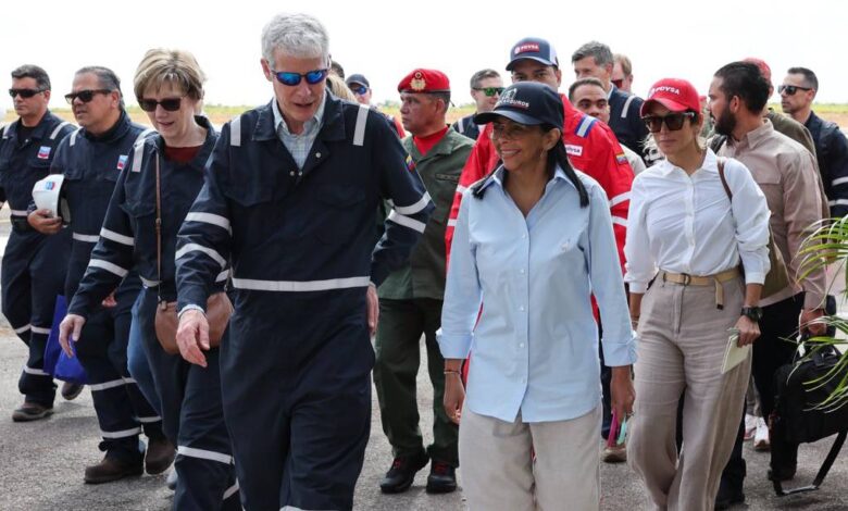 Delcy Rodríguez y el secretario de Energía de EE. UU. Wright a empresa mixta Petro Independencia de la Faja Petrolífera del Orinoco”, dijo el ministro de Comunicación, Miguel Ángel Pérez Pirela, en un mensaje en Telegram que acompañó con una foto de la “mandataria encargada” y el funcionario estadounidense vestido con overol.